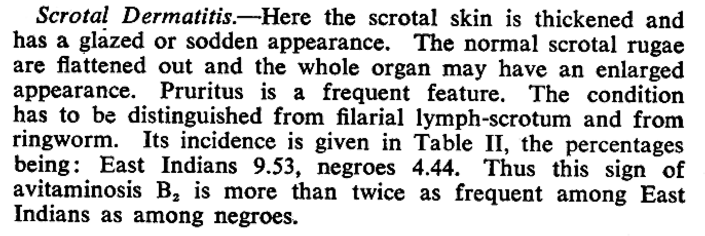Dr. Earle's solution to the problem was to subject each applicant to a brutally invasive physical exam that involved, among other things, a meticulous examination of the man's scrotum – a flabby scrotum being a sure sign of vitamin B2 (riboflavin) deficiency, according to Dr. Earle, as put forth in his medical jargon (at right).